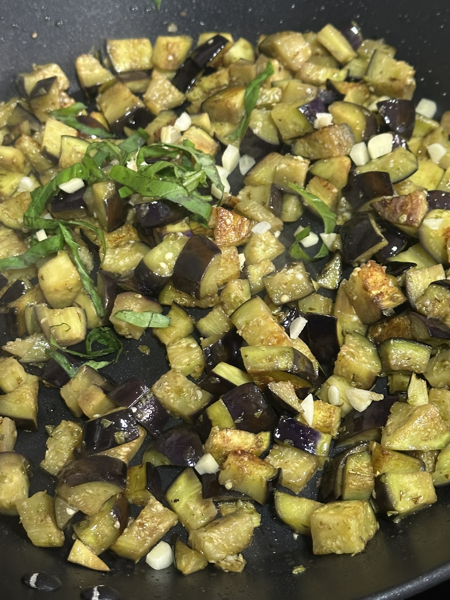 Calentamos una cazuela el aceite añadimos las berenjenas y las freímos a fuego medio junto con 1 cucharada de orégano. Cuando veamos que no queda ningún resto de agua que pueden soltar las berenjenas, añadimos el ajo laminados y la albahaca picada.