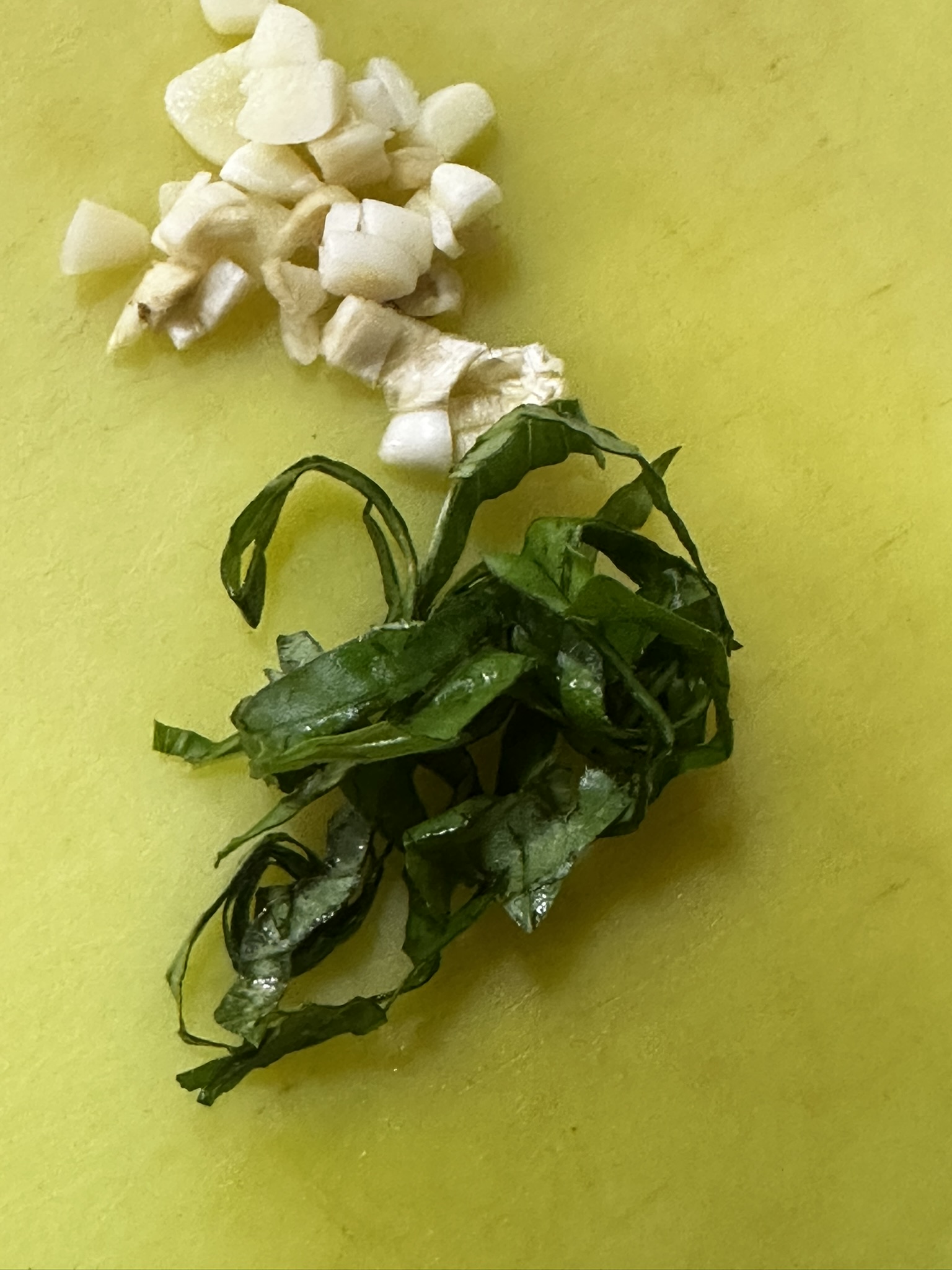 Mientras, pelar y laminar los ajos y picar las hojas de albahaca. Reservamos.