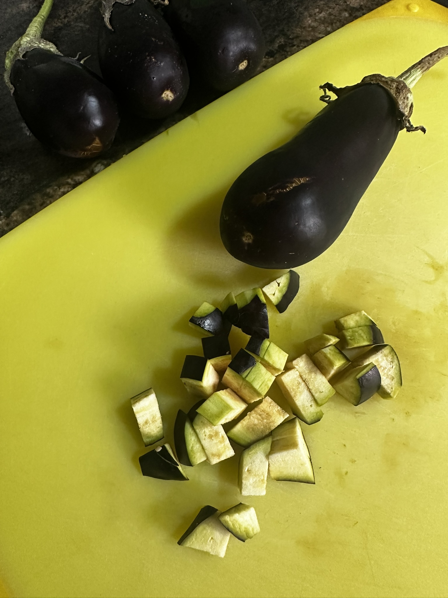 Comenzamos cortando las berenjenas en dados pequeños. Los ponemos en un bol que habremos llenado de agua con bastantes sal. Ponemos un plato encima y un peso para que las berenjenas queden bien hundidas, este paso es para que pierdan amargor y humedad. Pasado unos quince minutos, escurrimos las berenjenas y las secamos con un poco de papel de cocina.