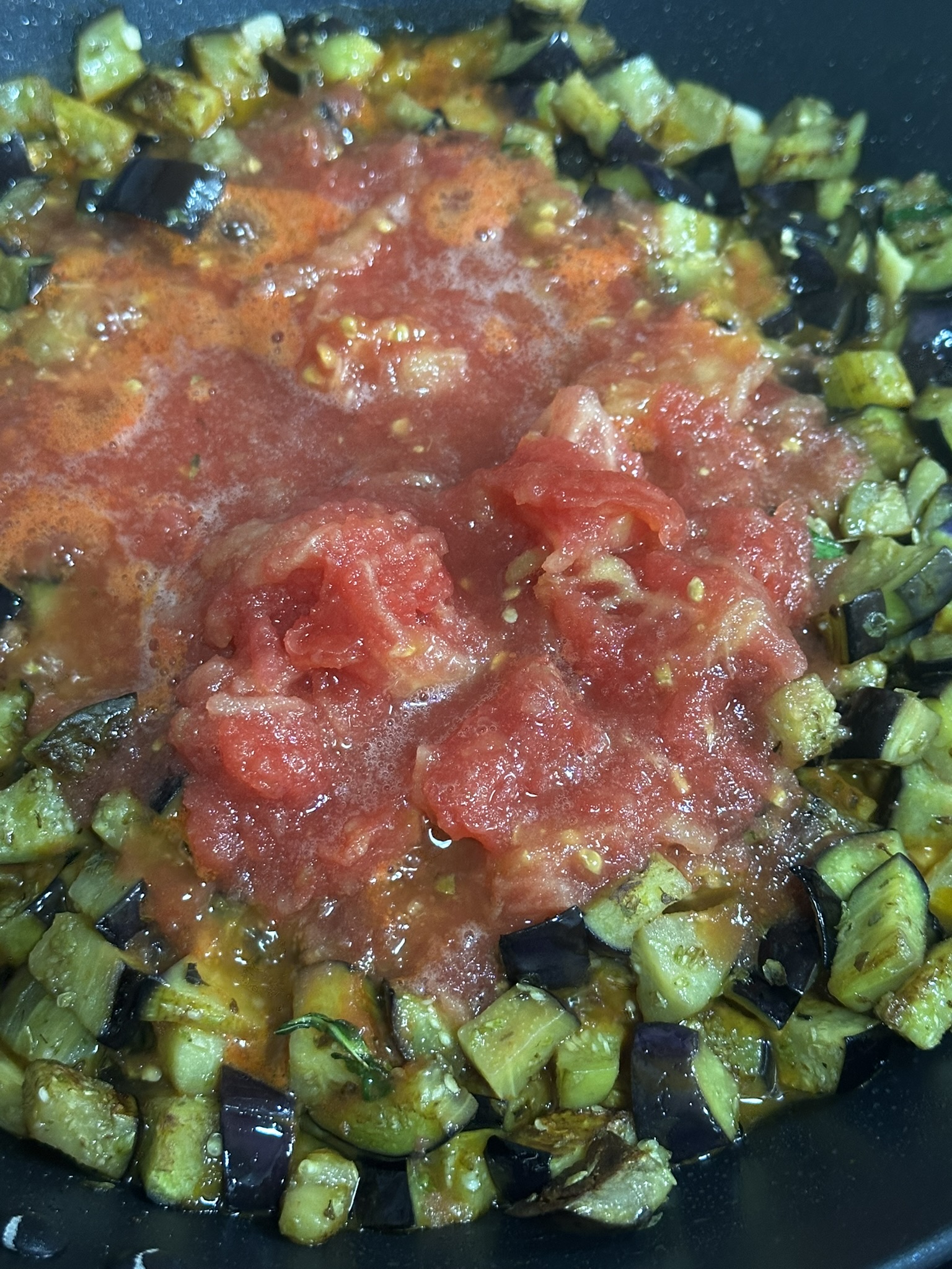 Cuando las berenjenas comiencen a dorarse, añadimos el tomate rallado o triturado y el vinagre, mezclamos bien y dejamos que la salsa reduzca a fuego lento puede tardar unos 15 minutos.