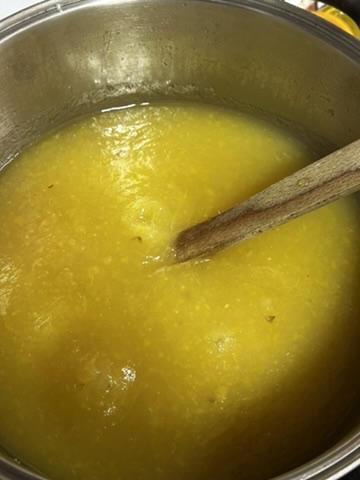 Al día siguiente, escurrimos bien el agua y colocamos los restos del limón en una olla. Añadimos el azúcar y removemos. Incorporamos también el zumo que habíamos reservado.