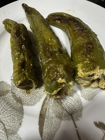 Pimientos verdes rellenos de tortilla de patatas y berenjena