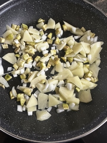 Ponemos la sartén al fuego con poco aceite. Freímos las patatas cortadas, la cebolla y la berenjena a fuego medio, manteniendo la sartén tapada mover de vez en cuando.