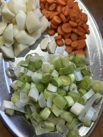 Pelamos el ajo y lo laminamos. A continuación, cortamos el puerro por la mitad y luego en trozos de aproximadamente medio centímetro de grosor. Cortamos también la zanahoria en rodajas del mismo tamaño.