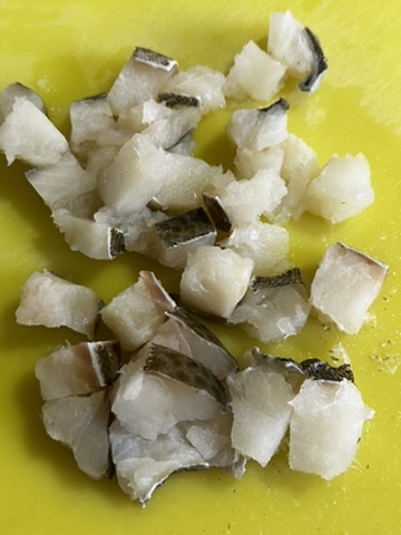 4. Mientras tanto, cortamos el bacalao en trozos de bocado.