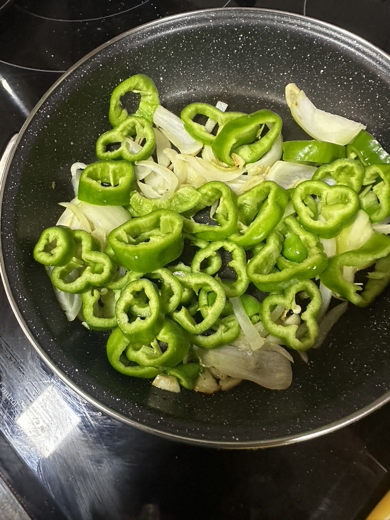Debemos cocinar a fuego medio-alto, tapado al principio, cuando los pimientos estén casi cocinados, destapamos y sofreímos un poco más.